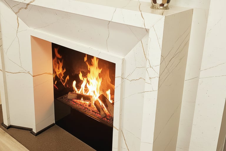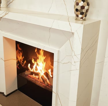 Discover the pinnacle of modern elegance with our collection of contemporary fireplaces. We designed this fireplace to be the undisputed heart of the home, meticulously crafting every detail to achieve a perfect balance of elegance and function. Its clean, architectural lines are wrapped in a luxurious marble-effect finish, and to achieve that seamless, high-end result, we painstakingly matched the subtle gold veins across every single panel. This demanding technique ensures the pattern flows uninterrupted around the entire structure, a hallmark of bespoke quality and precision. More than just a source of heat, we engineered this piece as a multifunctional hub for modern living, seamlessly integrating an entertainment system above the mantel. This project showcases our passion for creating breathtaking statement pieces that are not only visually stunning but are built to be the center of life, warmth, and memory-making for years to come.