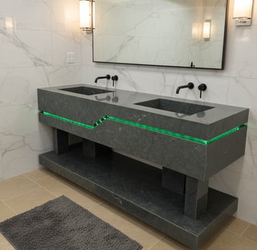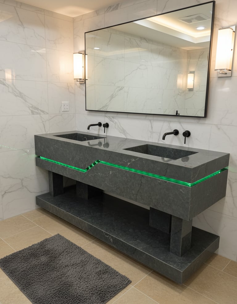This custom-designed double sink is more than just a functional element—it’s a statement of modern craftsmanship. Carved from premium stone with bold, architectural lines, it exudes strength and sophistication. The sleek integrated basins and floating design create a seamless look, while the dramatic LED inlay adds a striking contemporary edge that redefines the atmosphere of any bathroom.